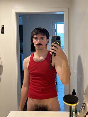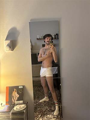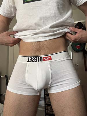 Je porte la moustache, je suis tout poilu intégralement et je ne suis pas un obsédé de l’industrie de la fashion. J’adore flirter avec des hommes, sans pression, sans scénario compliqué, juste du bon plaisir en bout de ligne. C’est bien tout ce que je veux. Je partage des photos de moi, avec fringues et puis de moins en moins… Tu n’hallucines pas, j’ai bien un très gros pénis moulé dans mon slip blanc Diesel. Curieux de voir la bête en action ?